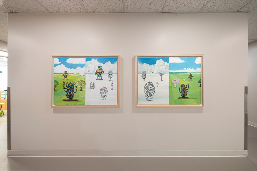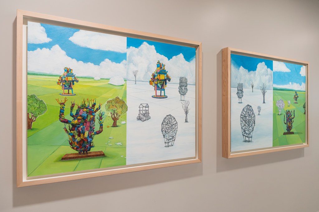 représentations de sculptures et des dessins se déploient dans un paysage